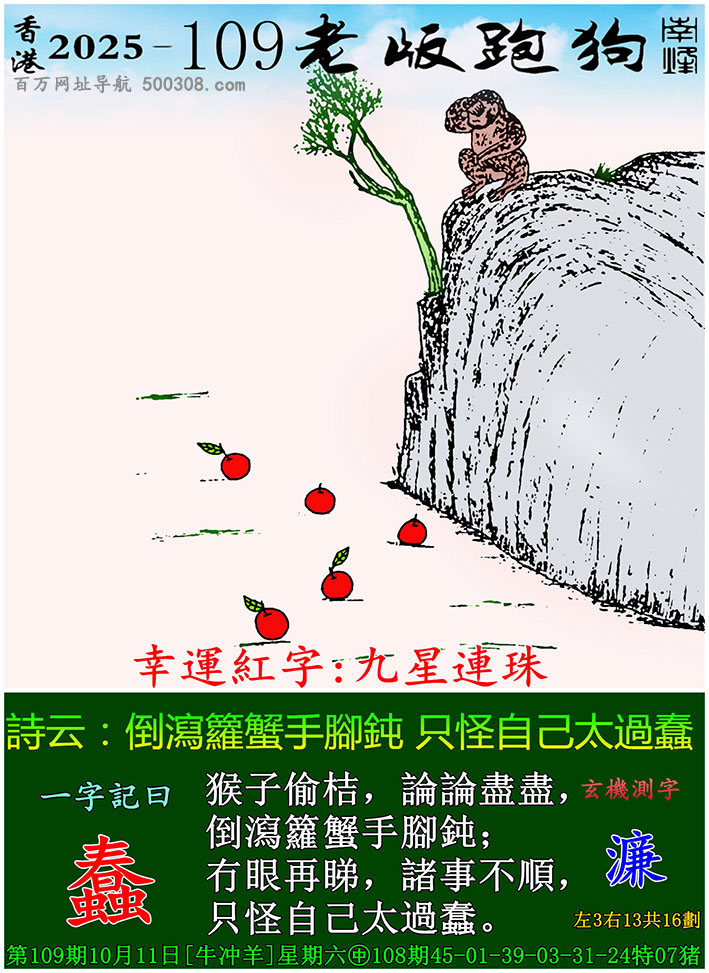 109期老版跑狗一字記之曰:【蠢】 詩雲:倒瀉籮蟹手腳鈍,只怪自己太過蠢。